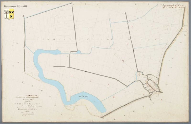 Oude kadasterkaart uit de periode 1811-1832 waarin water en wegen wat zijn gekleurd i.v.m. de duidelijkheid.