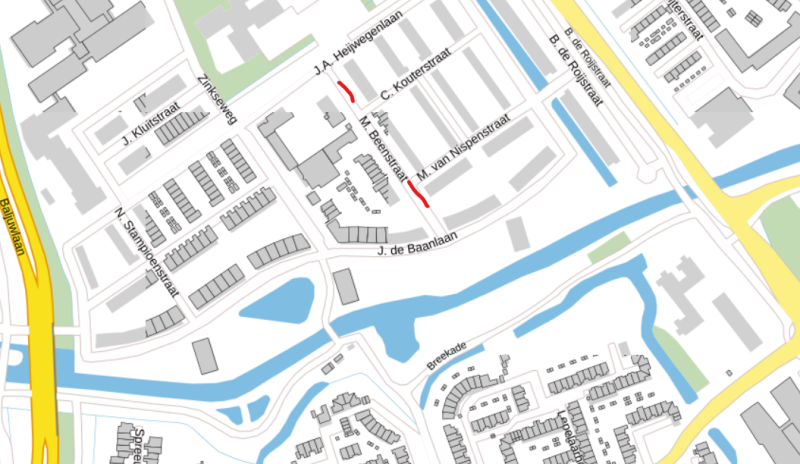 Marrewijkslop ( Nieuwstraat ) vanaf J . van Bodegom tot A . Stout ; Marrewijkseweg , ( Achterweg , Nieuwstraat ) vanaf de fabriek Marco tot Joh . Stout ; Vredehofplein ( Breeka ) vanaf A . Dekker tot A . D , Verlinde ; Vredehofstraat ( Breeka ) vanaf Ger . kerk tot schuur J . C . de Bloeme ; Dijkslop ( Voorstraat ) vanaf C . van Kralingen tot P . van Kralingen ; Breekade ( Breekade , Hoek ) vanaf H . Roeloffs tot L . A . Koornneef ; Spui ( Havenkade ) Abr . Kok ; Sluisdijk ( Veerweg , Nieuwstraat ) vanaf Wed . Kreeft tot M . Waleboer ; Westdijk ( Hoek , Westdijk ) vanaf A . M . van Trierum tot C . L . Tol ; Malledijk , ( Hoek ) vanaf W . Kraak tot K . van Kapel ; Oostkade ( Havenkade ) vanaf P . van der Slot tot KI . van Hamburg ; Westkade ( Havenkade ) vanaf P . v . d . Sluijs tot M . Bakelaar ; Veerweg ( Veerweg ) vanaf C . Sluijter tot PI . Dekker ; Sintelweg ( ged . Achterweg ) vanaf J . van der Linden tot J . Kweekei ; Breeweg ( Breev/eg ) vanaf P . Huisman tot M . Snoeij ; Nobelstraat ( Betonstraat ) vanaf D . van Bodegom tot P . Poldervaart ; Groene Kruisstraat ( nieuw ) vanaf M . Plaisier tot J . Dubbeld ; Groene Slop ( ged . Voorstraat ) vanaf J . Lankhaar tot A . Her rewijnen ; Ie Kooistraat ( ged . Vermaatstr .) vanaf P . v . d . Engel tot W . Snater ; 2e Kooistraat ( ged . Vermaatstraat ) vanaf J . Gardenier tot A . van Heesen ; Zinkseweg