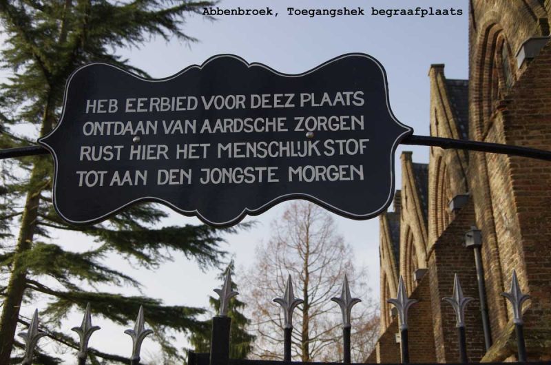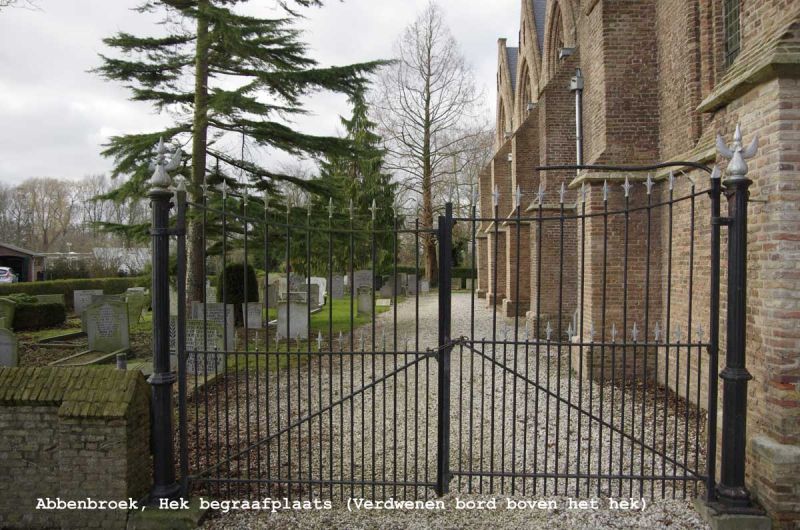 Het TOEGANGSHEK van de begraafplaats (foto 3-12-2013)naast de Hervormde kerk aan het Kerkplein te Abbenbroek is in de tweede helft van de negentiende eeuw geplaatst. Het betreft een hekwerk met symbolen, zoals met vleugels bekroonde pijlers en een plaquette met tekst, die verwijzen naar de functie van de begraafplaats en die richting geven aan de wijze waarop de begraafplaats dient te worden betreden. Eén vleugel is echter afgebroken. De begraafplaats is naast de linker zijgevel van de kerk gelegen. Een met kiezels bedekt pad voert langs de kerk naar de begraafplaats, die is omringt door een lage bakstenen muur met ezelsrug. Het bord boven het hek was op 31-12-2014 net meer aanwezig.
